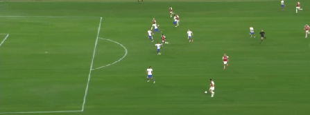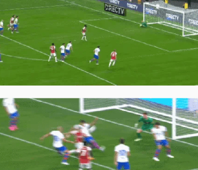 第44分钟萨卡底线附近挑传,厄德高头球一顶,哈弗茨在门前近距离凌空垫射得手帮助阿森纳队扳平比分。