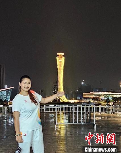 成都大运会开幕式泰国籍火炬手王远和成都大运会主火炬塔合影。受访者供图