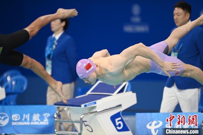 8月6日,覃海洋在成都大运会男子50米蛙泳决赛中夺金。图为覃海洋起跳瞬间。中新社记者 张浪 摄