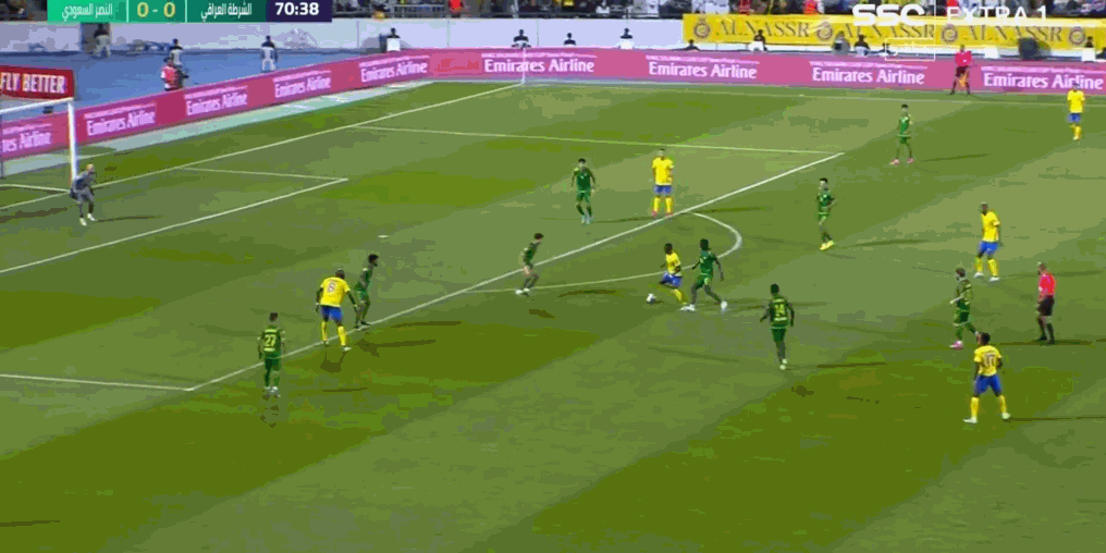 第52分钟,哈纳姆禁区右侧倒三角传球,C罗转身右脚抽射打得太正。