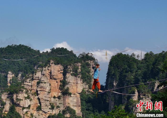 8月22日,2023年张家界黄石寨高空扁带赛上,来自法国的选手本在扁带上如履平地,夺得冠军。 吴勇兵 摄