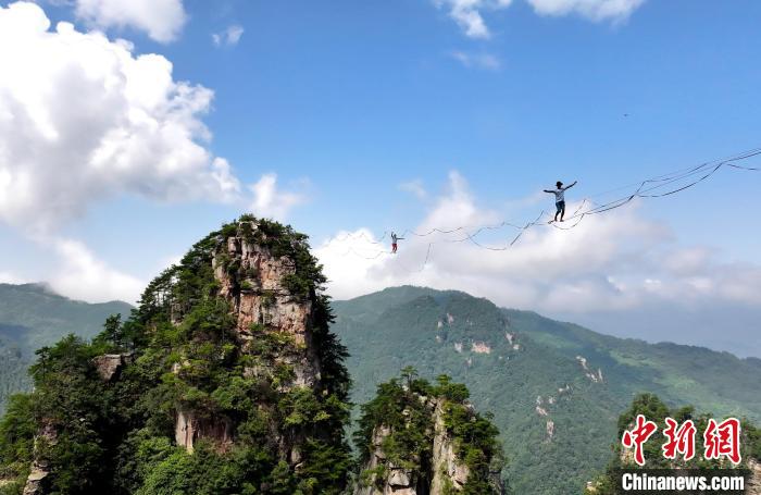 8月22日,2023年张家界黄石寨高空扁带赛上,选手行走在黄石寨山峰之巅的扁带上,宛如云端漫步。吴勇兵 摄