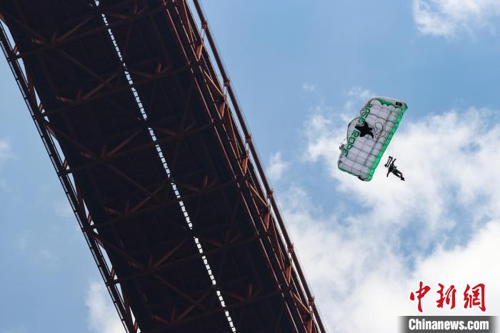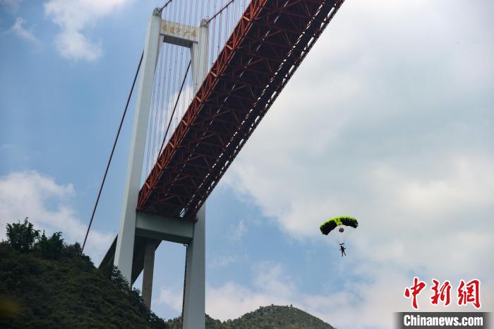 图为运动员在坝陵河大桥进行低空跳伞。瞿宏伦 摄