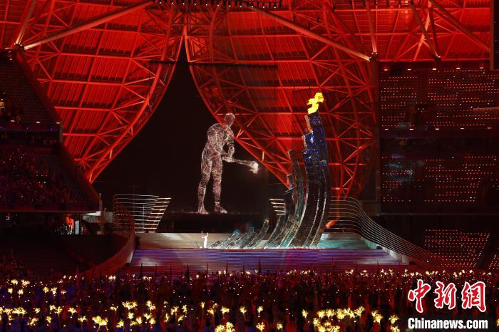9月23日,在杭州奥体中心体育场,浙江籍游泳运动员汪顺与“数字火炬手”点燃主火炬塔。 中新社记者 富田 摄