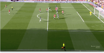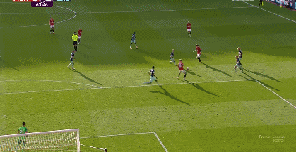 卡塞米罗在中圈处被断球,小蜜蜂快速反击,马奎尔、林德洛夫的拦截忙中出错,延森速度不快、角度不刁的射门,奥纳纳也扑不住,曼联0-1落后。