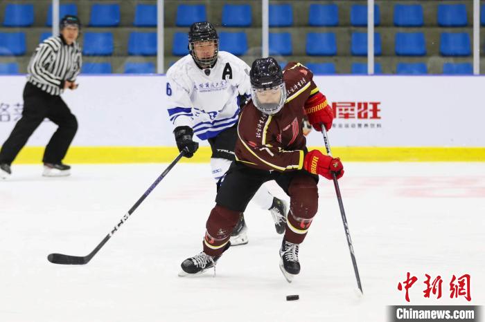 29日,“犀旺杯”第4届全国大学生冰球联赛在北京奥众冰上运动中心落下帷幕。共有来自全国10个省份的14球队、250余名冰球运动员参赛。图为球员在比赛中。赛事组委会供图
