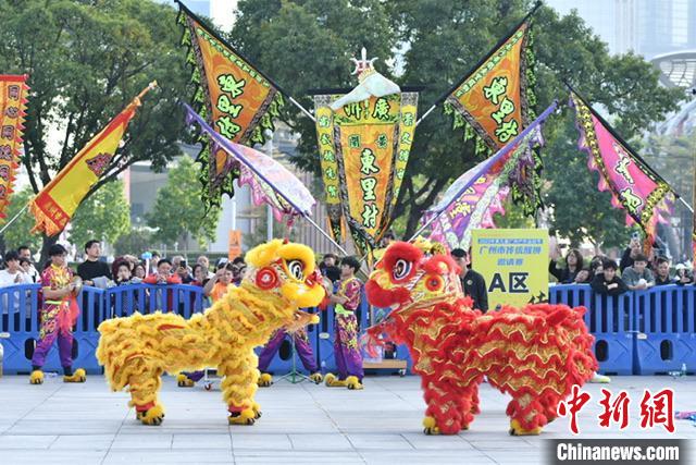 据介绍,传统醒狮运动作为岭南传统体育文化的优秀代表,蕴藏着中华民族特有的精神价值和民族情结。此次比赛由广州市体育局、广州市体育总会主办,广州市武术协会承办,吸引了超过60头醒狮、410名运动员参加。 比赛开始,龙狮运动队伍依次带来了《莲花池夺宝》《过桥寻宝》《醉狮》等主题演出,轮番上台秀出看家绝技。其中,天河区代表队、海珠区代表队海珠精英武术龙狮会等热门队伍登场时,迎来了现场观众此起彼伏的欢呼声和呐喊声,该队伍曾代表广州市出征广东省第十六届运动会群众体育组龙狮比赛,并夺得成年男子组冠军,其醒狮步伐、动作神态栩栩如生,喜怒哀乐惊疑动静的醒狮形神表现得淋漓尽致,引得现场掌声不断。
