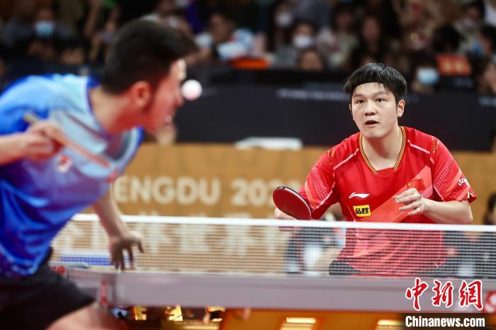 5日下午,樊振东(右)在成都混合团体世界杯比赛中。 记者 易海菲 摄
