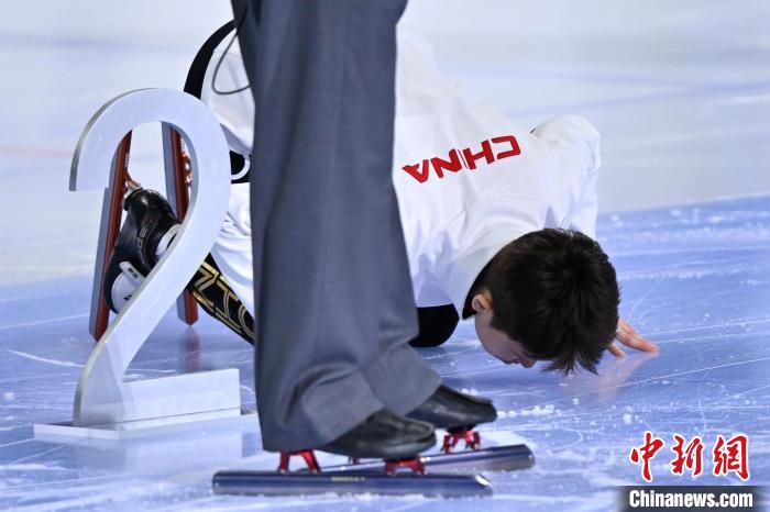 12月9日,2023-2024赛季国际滑联短道速滑世界杯北京站于首都体育馆继续进行。中国选手范可新在女子500米中摘银。图为范可新在颁奖仪式上亲吻冰面。 中新社记者 赵文宇 摄