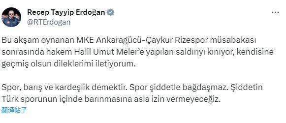 里泽斯堡俱乐部则表示了对主裁判梅勒的支持:“我们强烈谴责今天与安卡拉古库比赛后发生的不良事件。我们向整个裁判界,特别是本场比赛的裁判哈利尔-乌穆特-梅勒表达我们的祝愿,祝愿他早日康复。” 土耳其总统发声 据悉,37岁的梅勒是土耳其顶级裁判之一。他为国际足联执法国际比赛,同时也在欧足联的精英裁判名单上。法鲁克-科卡今年59岁,自2021年起担任安卡拉古库俱乐部主席。 这起恶性事件发生后,土耳其社会各界都对球场暴力进行了抨击。土耳其青年和体育部长奥斯曼-阿斯金-巴克在个人社交媒体写道:“我强烈谴责安卡拉古库俱乐部主席对裁判梅勒的袭击。我们不想在我们的球场上看到这些画面,这不符合体育精神和土耳其足球。”