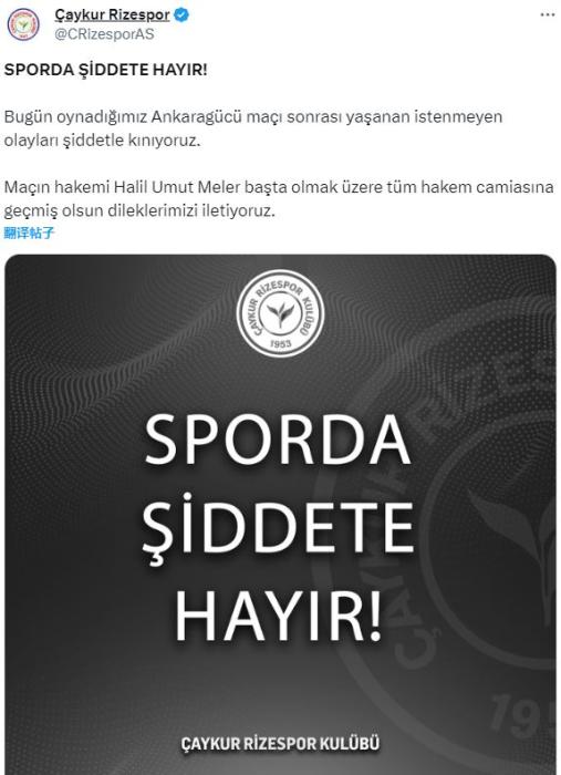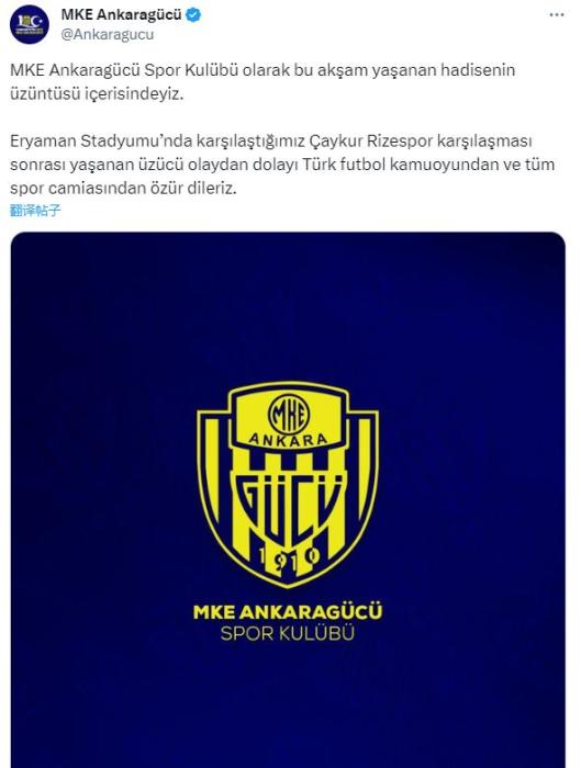 与此同时,安卡拉古库俱乐部也发表道歉声明,就这起暴力事件向球迷道歉。“我们对今晚发生的事情感到悲痛,我们向土耳其足球公众和整个体育界道歉。”俱乐部在声明中这样写道。