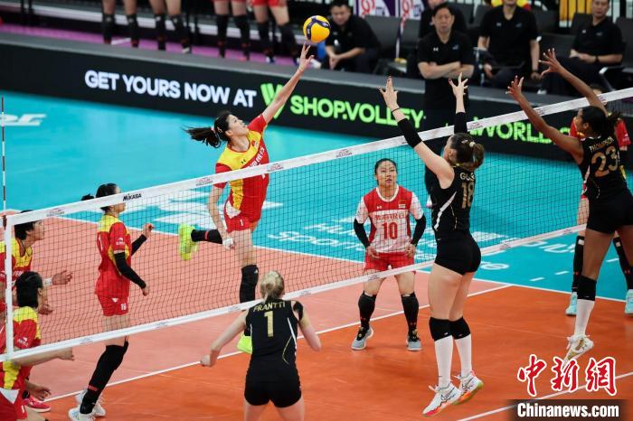 女排世俱杯赛场上,天津渤海银行女排(红)对阵巴西海滩女排(黑)。主办方供图