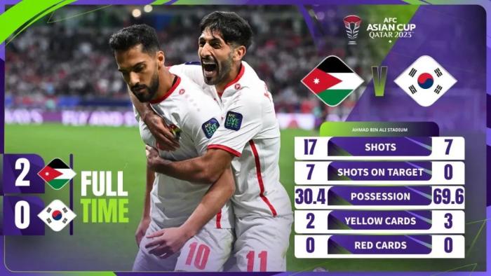 韩国队0:2约旦队比赛数据。图片来源:亚洲杯