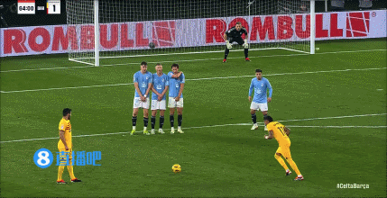 第65分钟,巴萨前场任意球机会,拉菲尼亚主罚直接打门,门将个单掌将球托出!↓