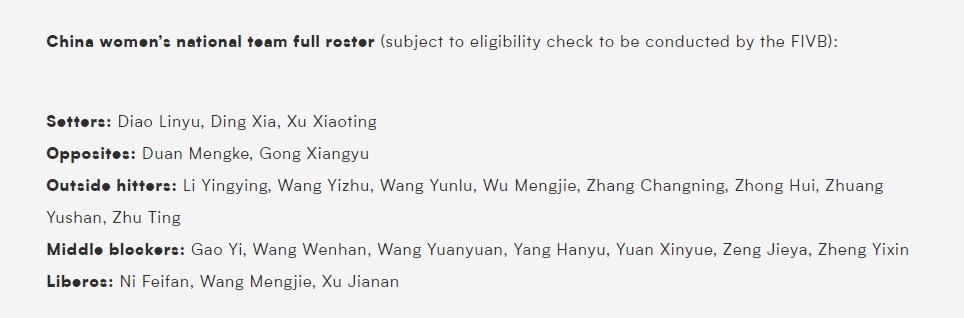 据悉,该名单还将接受国际排联资格审查。具体名单如下: 主攻:朱婷、李盈莹、张常宁、王云蕗、王艺竹、吴梦洁、仲慧、庄宇珊 副攻:袁心玥、郑益昕、王媛媛、杨涵玉、高意、王文涵、曾洁雅 二传:刁琳宇、丁霞、许晓婷 接应:龚翔宇、段梦可 自由人:王梦洁、倪非凡、许嘉楠
