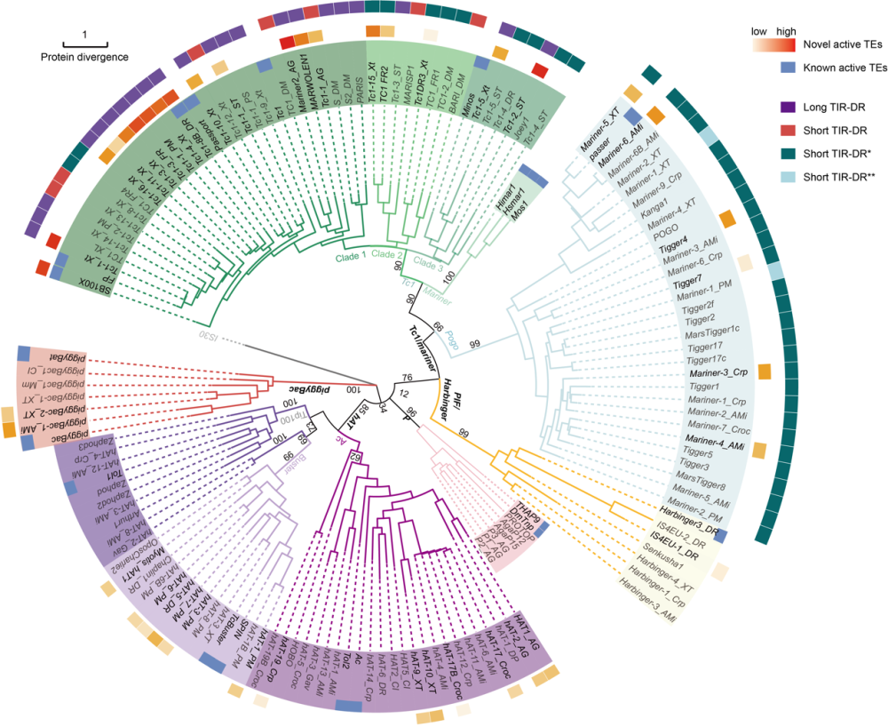 科技日报记者 陆成宽 DNA转座子也称跳跃基因,可被用作基因工程工具。近日,中国科学院动物研究所张勇和王皓毅研究组开展了迄今为止最大规模的DNA转座子活性筛选,构建了目前最大的活跃DNA转座子数据集,极大扩展了基于DNA转座子的基因工程工具箱。相关研究成果5日在线发表于《细胞》杂志。 130个新型DNA转座子和20个已知活跃DNA转座子的进化树。 DNA转座子约占人类基因组的2%,是一种天然的可以自主移动的DNA序列,可以演化为功能性基因或调控元件。DNA转座子跳跃是物种进化的重要动力,有助于宿主适应恶劣环境。 然而,在长期演化的过程中,绝大多数的DNA转座子失去了转座活性,只有少数转座子被开发为基因整合的工具,用于基因治疗、挖掘新的基因和功能元件等。因此,亟待系统挖掘具有不同功能特点的DNA转座子工具。 此次,科研人员从102个无脊椎和脊椎动物基因组中预测了130个潜在活跃的DNA转座子,同时,通过人源细胞中的高通量实验,筛选验证了40个转座子具有异源转座活性。这一结果将哺乳动物中活跃转座子载体的数目从20个提升至60个,大幅拓展了DNA转座子的进化多样性。 基于此,科研人员进一步开展了基础研究与应用研究两个层面的系统探索,一方面解析了DNA转座子的活性相关因素和进化动态,揭示了其多样化的功能特征;另一方面也阐明了来自蚊子Mariner2_AG转座子在CAR-T细胞治疗中的优越性能和临床应用潜力。