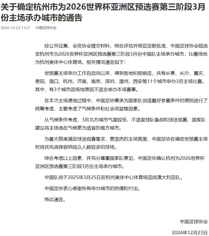 在官方网站发布的公告中,中国足协解释了将国足对阵澳大利亚这场比赛的主场安排在杭州的原因。长春、长沙、重庆、西安等11个城市申办,3个城市因场地原因不适合举办本场赛事,足协考虑了气候条件和社会效益等因素,统筹综合考虑将主场选在杭州。