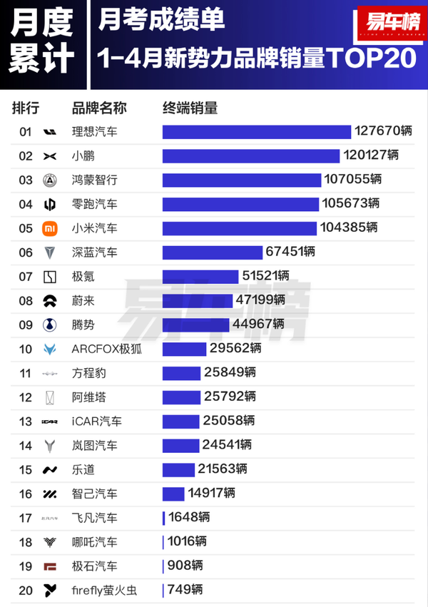 除了这前五强之外,其他造车新势力的表现也各有不同。极氪汽车在1月至4月期间,销量为51521辆;蔚来汽车曾是造车新势力的领军者之一,但此次销量为47199辆,排名与以往相比有所波动;腾势汽车销量为44967辆;ARCFOX极狐汽车销量则为29562辆。