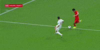 第9分钟,王钰栋杀入禁区后遭遇阿明-贝纳迪的铲球后下底急停扣球,随后奋力起身时被对手放倒,但主裁示意不是点球,VAR介入也确认不是点球。