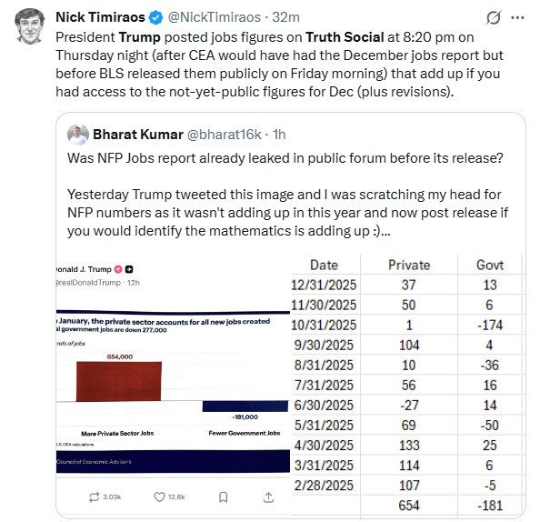 特朗普的贴文显示,自1月以来,美国新增65.4万个民间就业岗位,政府工作岗位减少18.1万个,而这些数据是劳工部周五在12月就业报告中才公布的。总统通常会提前一天收到就业报告。