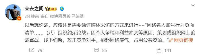 虽然官方目前没有发布公告,但微博CEO“来去之间”发布了了条内容称:以后想论战,应该还是需要通过媒体采访的方式来进行。
