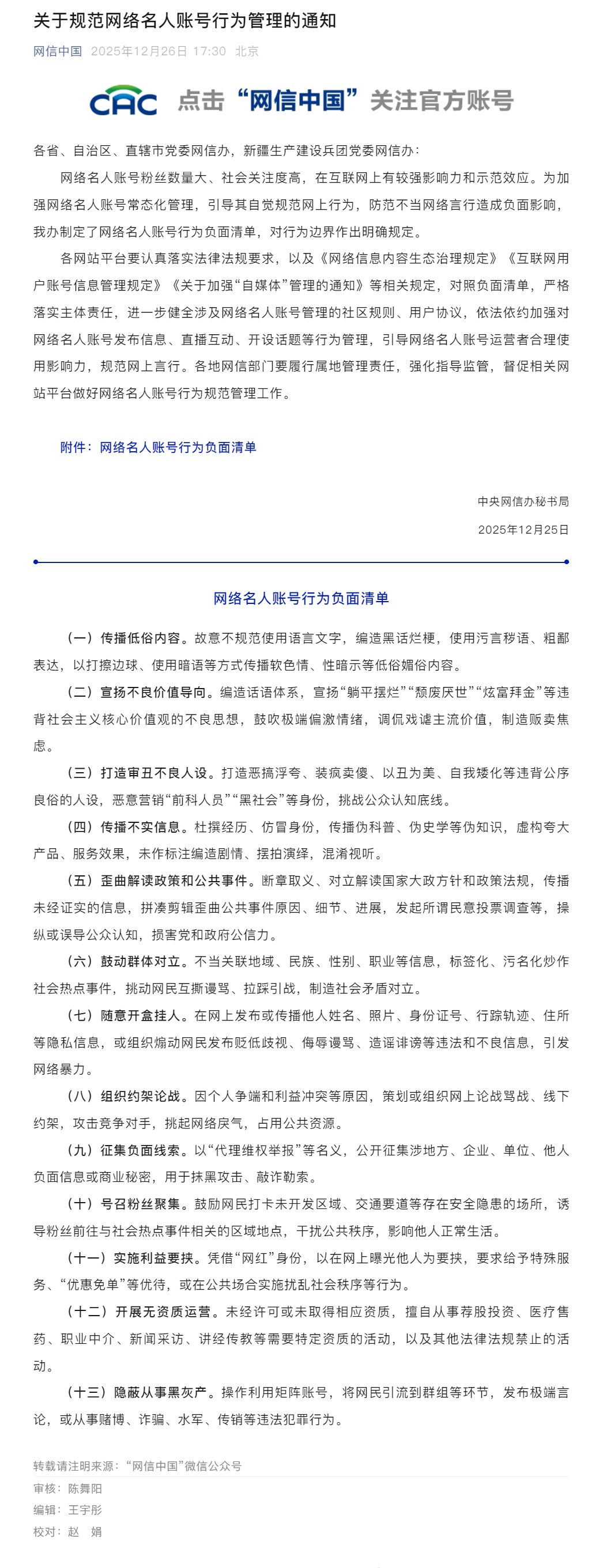 同时他还摘取了上个月网信办发布的《关于规范网络名人账号行为管理的通知》,其中公布的网络名人账号行为负面清单中有一条: