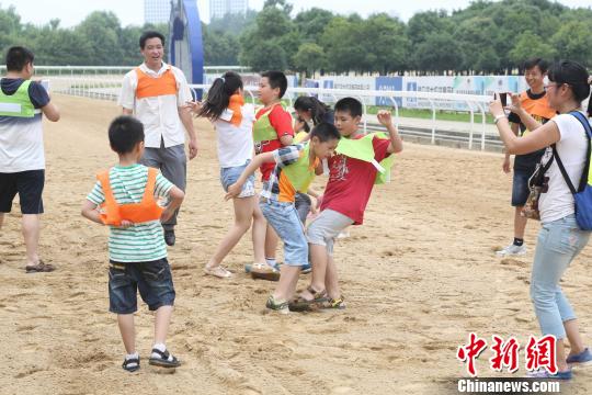 图为,武汉小朋友们在东方马城赛道上玩游戏。 谈偲偲 摄