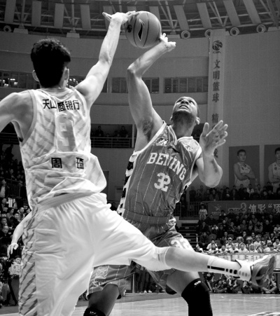 昨天,新疆球员周琦(左)封盖北京首钢队球员莫里斯的投篮。